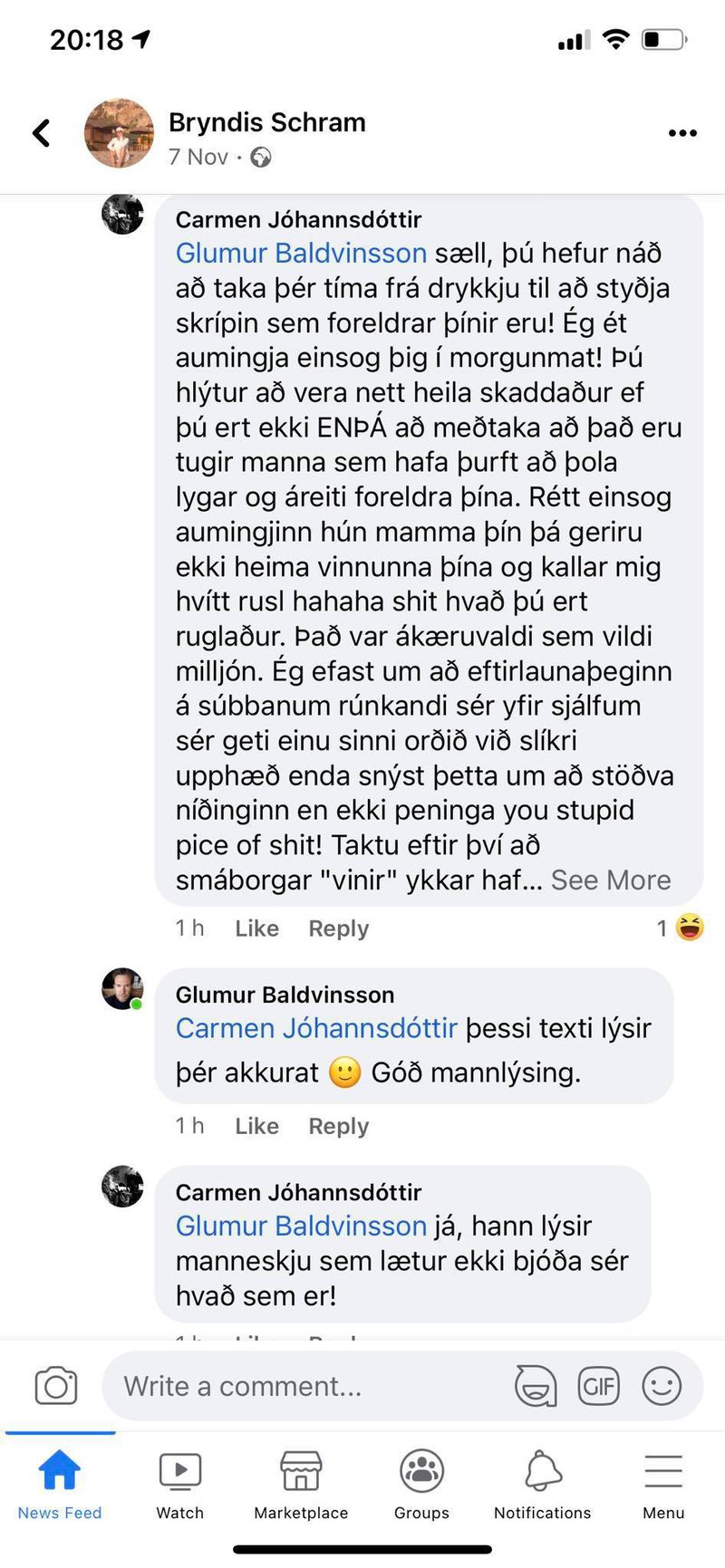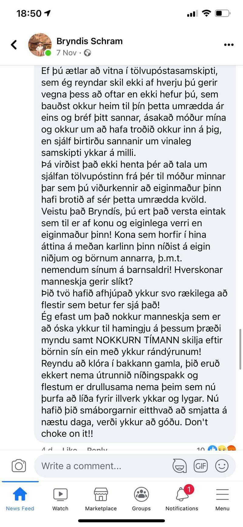 „Saklaus móðir mín fékk hrottalegan póst frá konunni sem sakar föður minn um rassastroku utanklæða og nú heldur áfram fyrir dómstólum. Pósturinn var svo illgjarn og beindist ekkert að föður mínum heldur móður. Sjá skjáskot fyrir neðan af skrifum hennar sem ég fann með hjálp vinar,“ skrifar Glúmur.