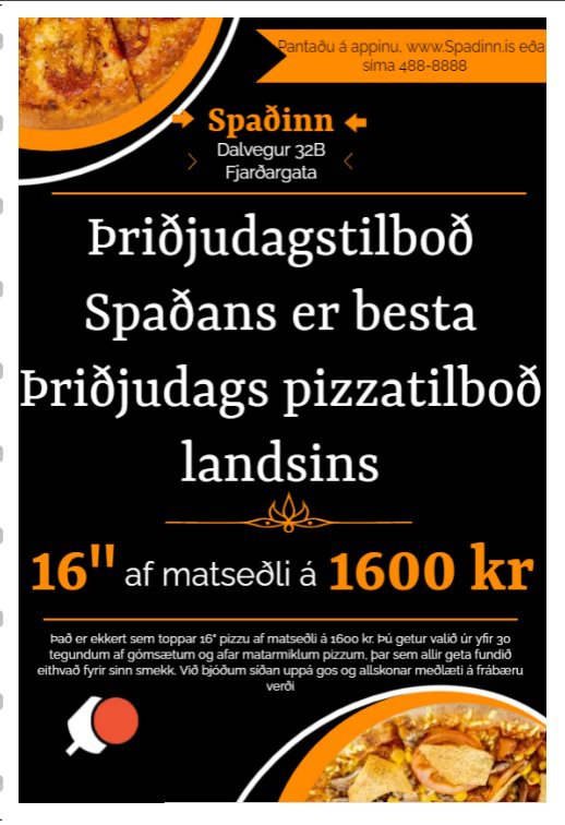 Þriðjudagstilboð Spaðans felur aftur á móti í sér 16“ pizzu af matseðli á 1.600 krónur. Í auglýsingunni í Fréttablaðinu segir meðal annars: